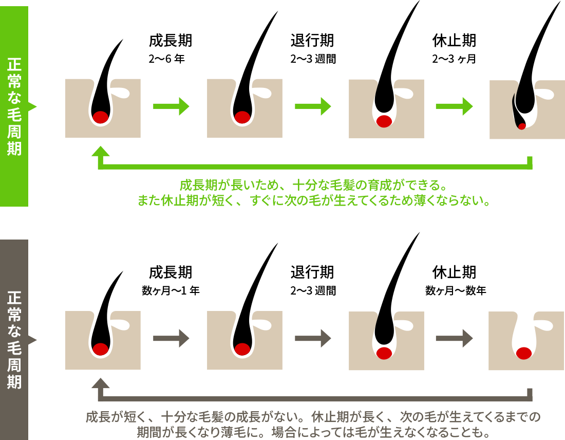 髪が全く生えないような場所でも、毛母細胞は存在しています。毛母細胞が長期的な休止期に陥った原因は毛周期の乱れによるものです。これを正常な毛周期に戻すことができれば、毛髪は再生する可能性が高いです。