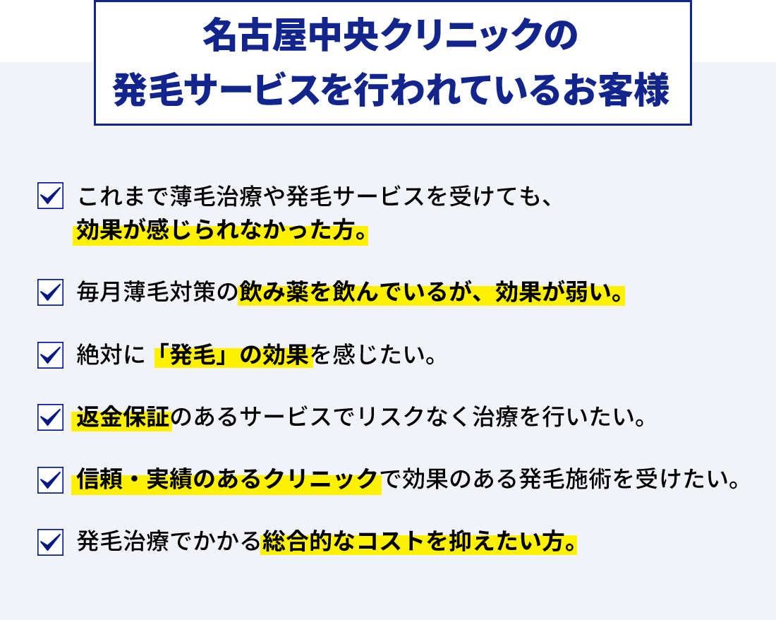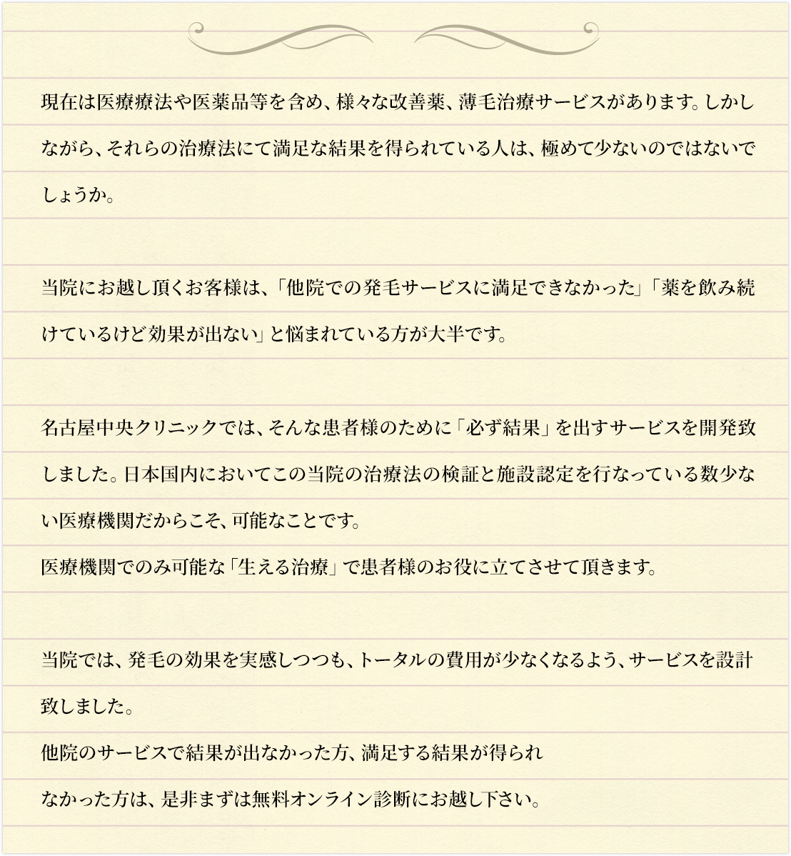 名古屋中央クリニックの発毛サービスは、AGA医薬品や薄毛治療を試したけど、効果を感じられなかった方々に支持されています。