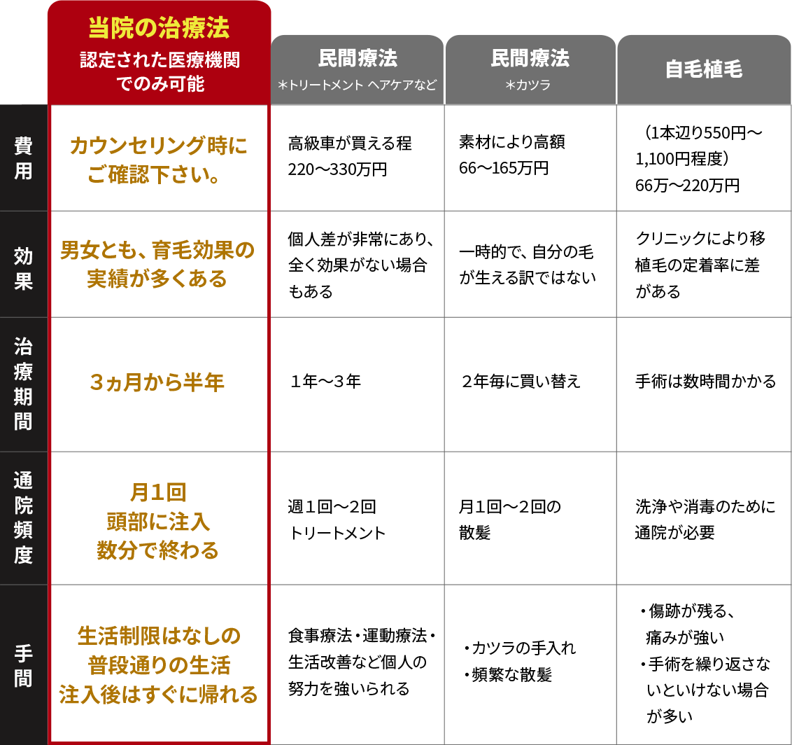 当院の治療法と 民間療法(トリートメントやカツラ)の比較